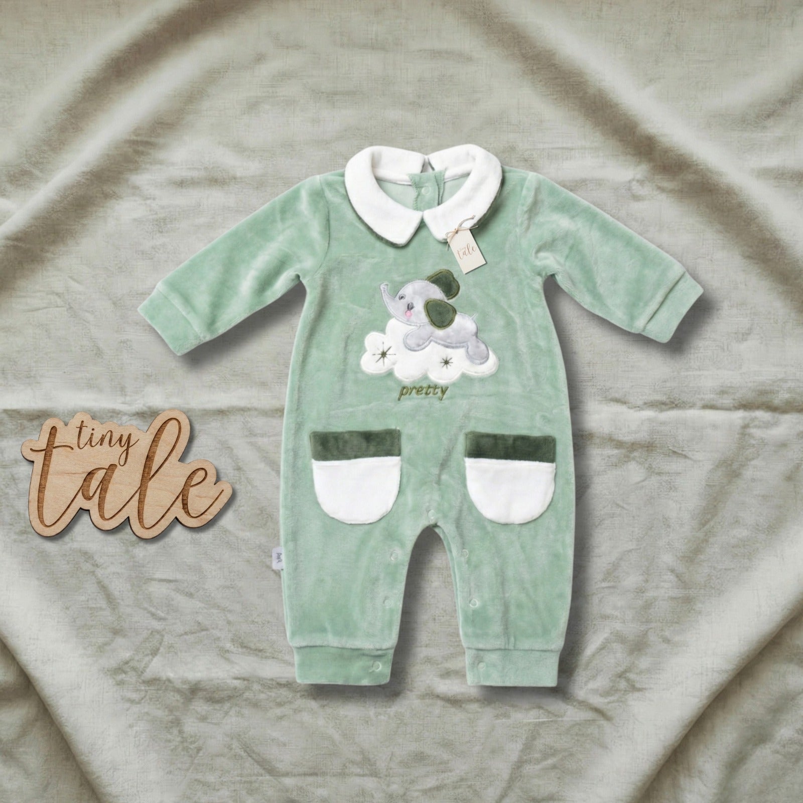 جمبسوت مخملي ناعم بأكمام طويلة باللون الأزرق الفاتح وياقة بيضاء، مزين بطبعة فيل مرحة في الأمام.
